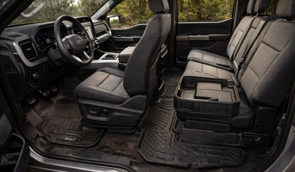 Many F-150 trims — especially Lariat, King Ranch, Platinum, and Lightning variants — offer Fold-Flat Storage or LUX under-seat storage boxes beneath the rear bench. These systems raise the rear floor height and alter liner clearance.